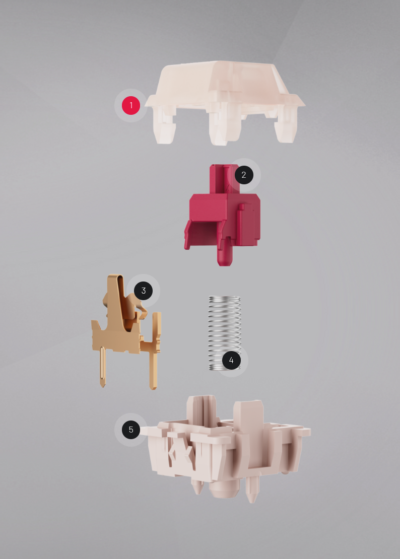 A CAD high-precision component made of plastic polymer specifically for the Cherry MX creates the pre travel and the keystroke feel between the upper housing and coil spring. The key cap is attached on the upper part of the stem.